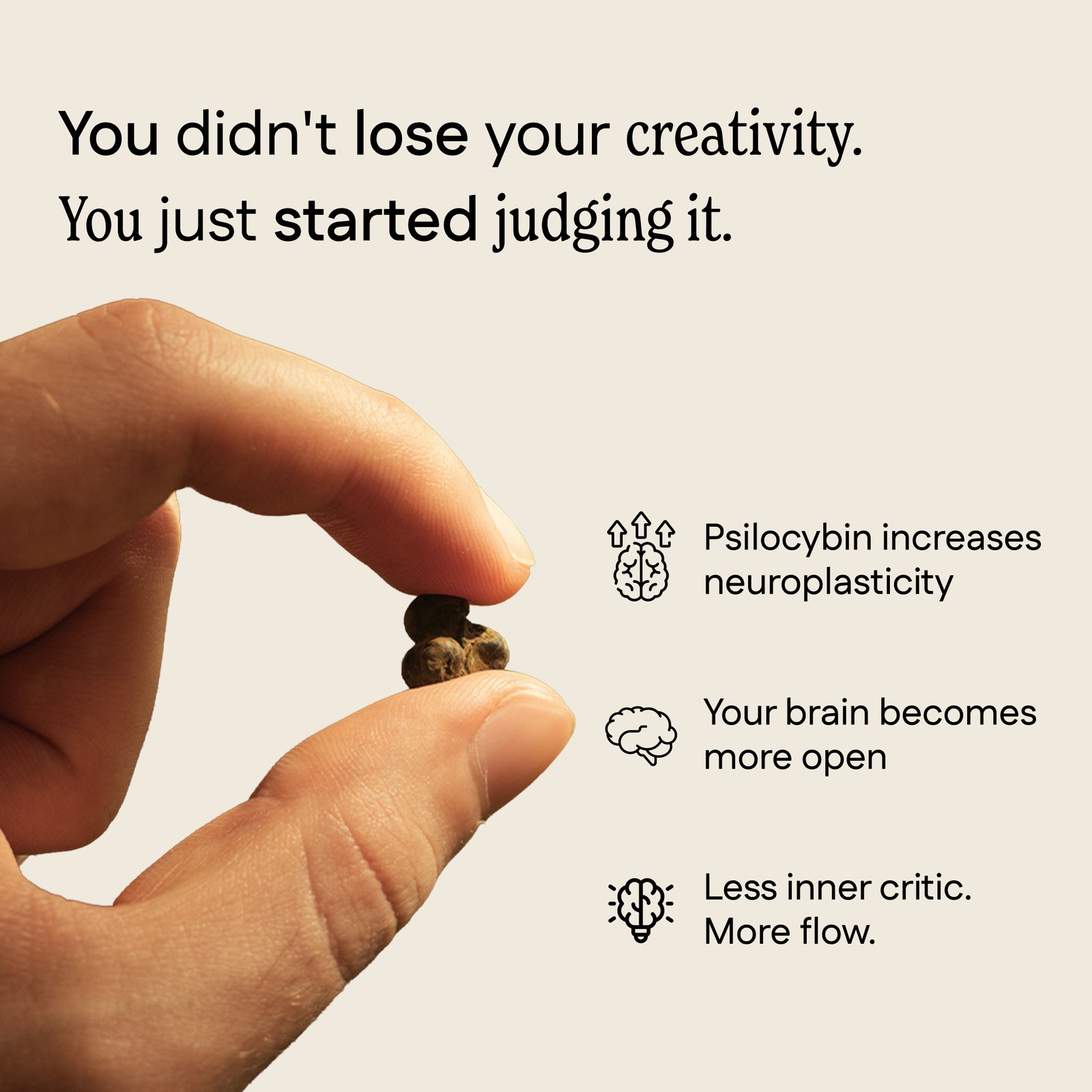 The active compound in our truffles binds to serotonin receptors, triggering the release of BDNF, a protein in your brain that drives neuroplasticity. That’s basically your brain’s ability to form new connections and break old ones. It becomes more flexible and open to change.